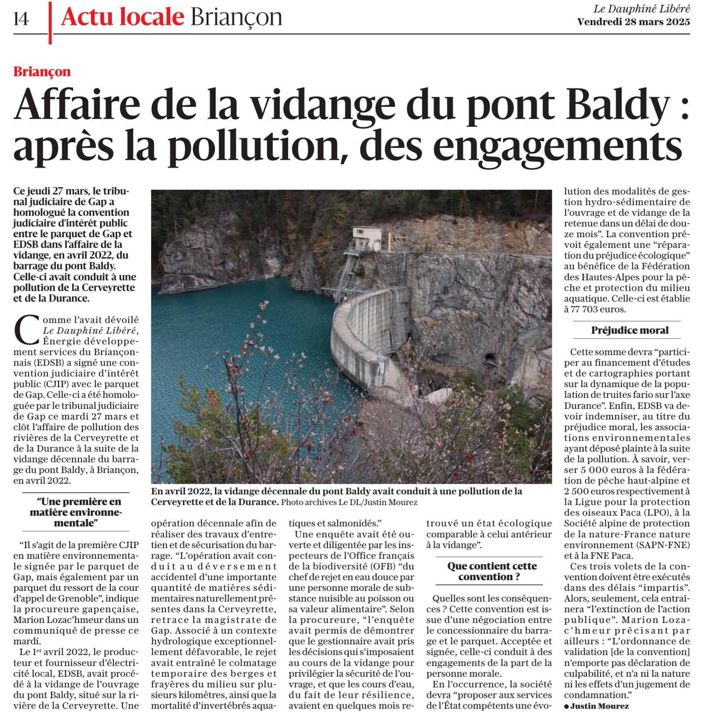 Ce jeudi 27 mars 2025, le tribunal judiciaire de Gap a homologué la convention judiciaire d’intérêt public entre le parquet de Gap et EDSB dans l’affaire de la vidange, en avril 2022, du barrage du pont Baldy. Celle-ci avait conduit à une pollution de la Cerveyrette et de la Durance.